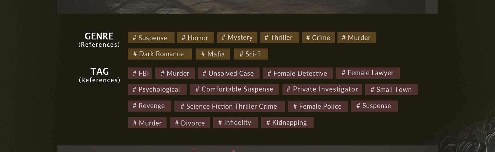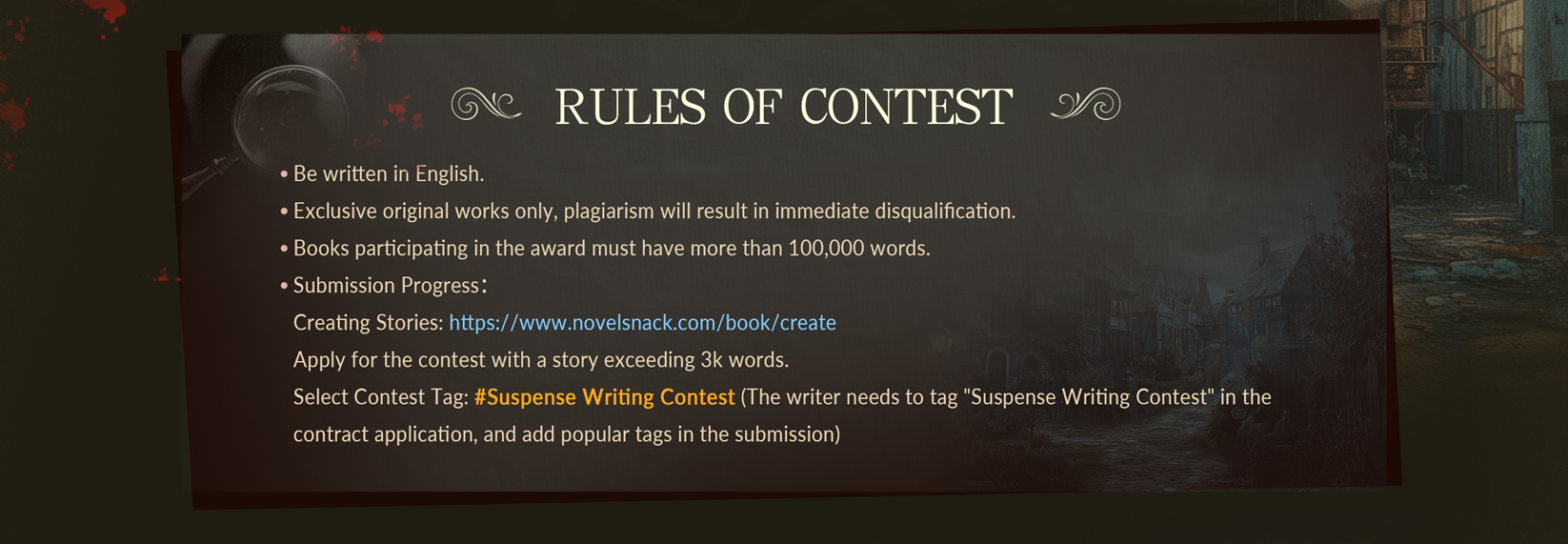 "Truth in the Shadows" Suspense Writing Contest 2025.7.10-2025.12.10 INTRO When the veneer of everyday life cracks, darkness seeps through the gaps. A series of grisly murders. A politician's mysterious death on the eve of an election. A suicide without a trace of motive. A husband vanishing into thin air. A cursed town. A strange kidnapping. Invisible threads of cyberbullying… You could be the detective chasing shadows, the unhinged psychopath, the professional assassin, or the hacker lurking in the depths of the internet... Revenge. Lies. Murder. Ghosts. Betrayal. Secrets. Love... What are those truths hidden beneath the mist? PRIZE 1st $3,000 2nd $2,000 3rd $1,000 *If the above winning works eventually reach 200K words, there will be an additional bonus of $1,000, which can be gained after the contest concludes. *The winning works must be no less than 100,000 words. Rising star $500*7 INSPIRATION 1. He’s an unemployed man drowning in debt, forced to rent out a room in his home. When a mysterious woman moves in, things spiral—strange noises at night, a rotting stench he can’t erase, and neighbors whispering behind his back. His darkest secret might not stay buried for long. 2. She’s a detective investigating a chilling threat: “Thirteen innocents must die for one guilty soul.” As a feminist activist’s tour sparks chaos, her friend becomes a bodyguard for the activist. Two seemingly unrelated events converge, revealing a deadly web of vengeance and justice blurred by obsession. 3. He was a big city defense lawyer who returned to his hometown to start a new life and work for family reasons. He immediately took over two cases: a rich kid was accused of murder, and a poor kid was accused of arson. Both swore they were innocent. In this small town in the South, the court rarely found someone guilty... 4.She is a single woman in New York who has always had little luck in love. Recently, she is deeply fascinated by her perfect new boyfriend. However, a case of a young woman being brutally murdered caught the police off guard. The murderer would date the victims before killing them. She began to suspect that her new boyfriend was involved in the murder... 5.She is a former Los Angeles police officer who resigned and moved to a coastal town in California to become a private detective. The seemingly quiet town is actually turbulent. In just 48 hours, she found the body of a teenager, and the locals warned her not to trust anything here... GENRE: Suspense/Horror/Mystery/Thriller/Crime/Murder/Dark Romance/Mafia/Sci-fi TAG: FBI/Murder/Unsolved Case/Female Detective/Female Lawyer/Female Police/Psychological/Comfortable Suspense/Private Investigator/Small Town/Science Fiction Thriller Crime/Revenge /Suspense/Murder/Divorce/Infidelity/Kidnapping MALE LEAD (Reference) Disillusioned Ex-Cop/Vengeful Hacker/Charming Con Artist/Stoic and Reserved Professor/Mafia Leader Haunted by Past Mistakes/Overconfident but Deeply Flawed Detective/Reluctant Hero with a Dark Secret FEMALE LEAD (Reference) Relentless Detective/Clever and Resourceful Journalist/Feminist Activist with a Fiery Spirit/Emotionally Guarded Artist/Mysterious and Enigmatic Scholar/Empathetic but Determined Psychologist/Fearless Bodyguard/Killer Driven by Revenge/Charming Manipulator with a Hidden Agenda/Courageous Survivor with a Soft Heart Rules of contest - Be written in English. - Exclusive original works only, plagiarism will result in immediate disqualification - Submission Progress: Creating Stories: https://www.novelsnack.com/book/create; Apply for the contest with a story exceeding 3k words. Select Contest Tag: #Suspense Writing Contest (The writer needs to tag "Suspense Writing Contest" in the contract application, and add popular tags in the submission) APPLY FOR ENTRY
