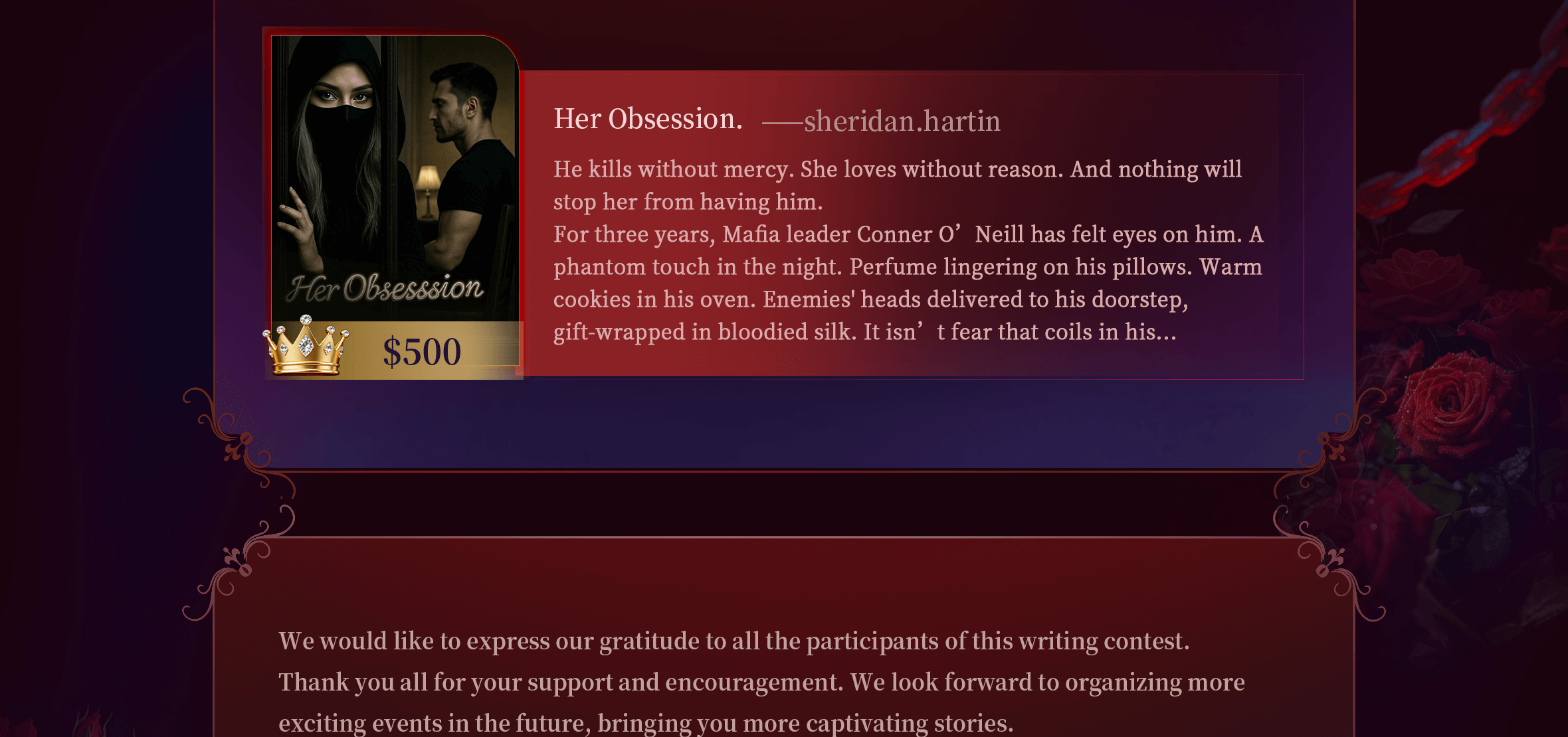 *If the above winning works eventually reach 200K words, there will be an additional bonus of $500, which can be gained after the contest concludes.